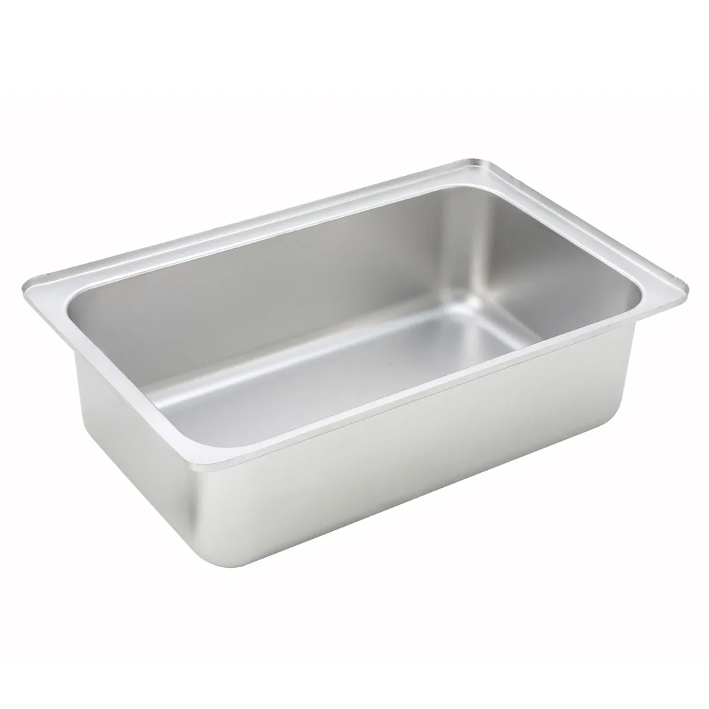 The Winco C-WPF6 water pan goes underneath full-size steam pans to hold the water and generate steam in order to keep food at serving temperatures. Holding the pan in place, this unit is rectangular with an upstanding edge, and because its stainless steel construction resists both warping and rusting, it endures heavy-duty use.